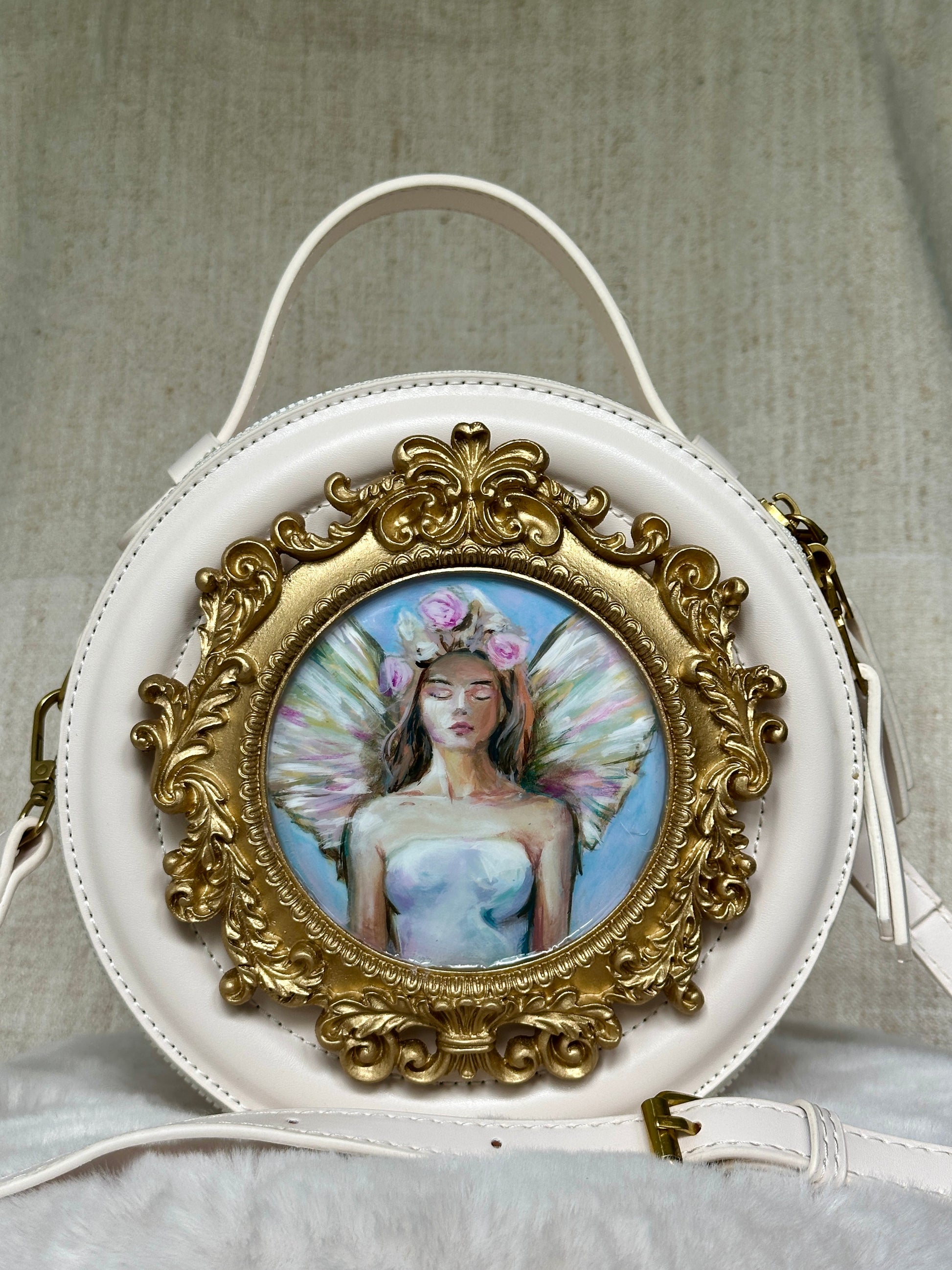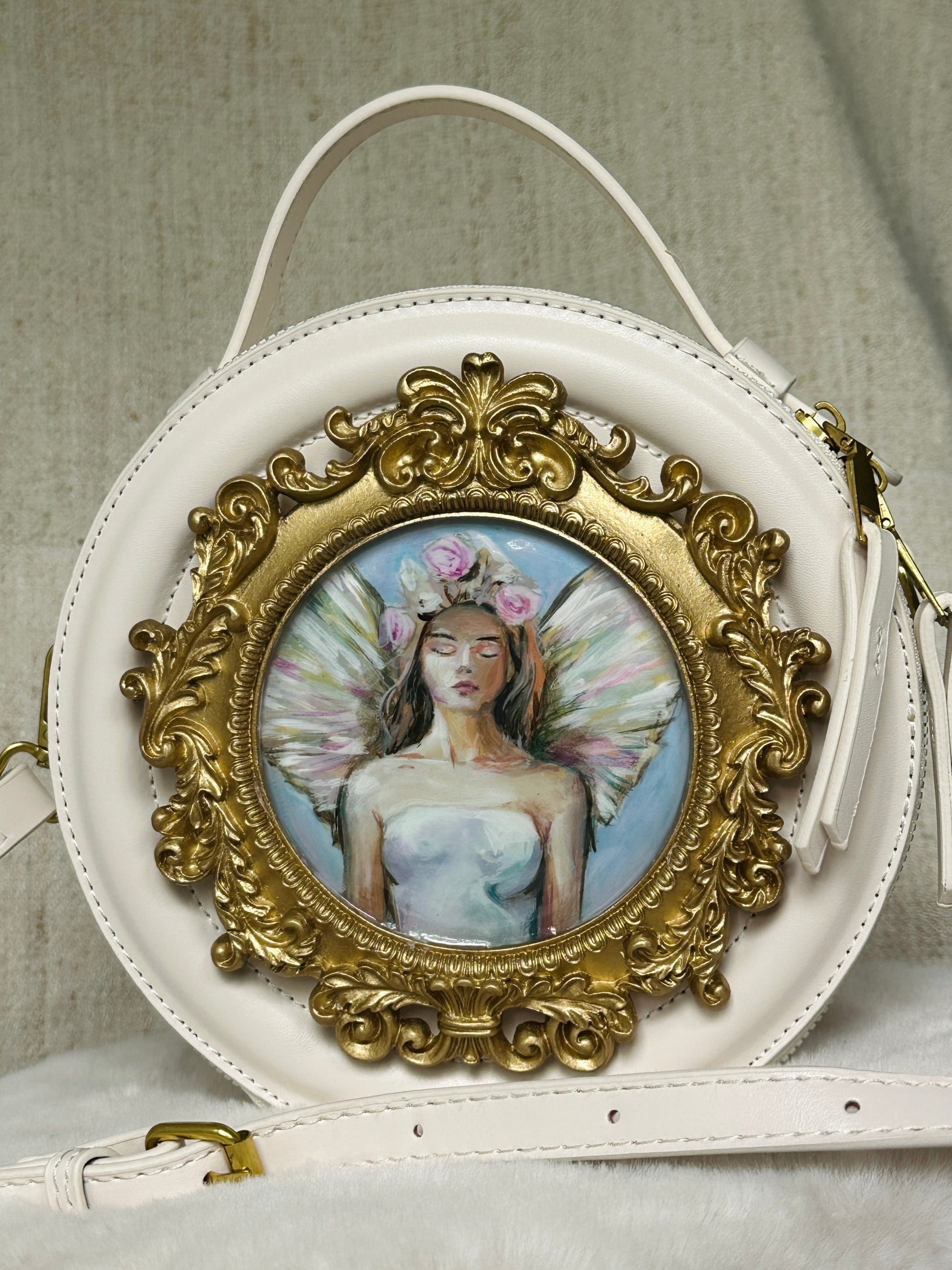 Geanta „Aripi Regale” este o declarație de lumină și noblețe. Pictura înfățișează o zână cu coroană de flori, cu chip senin și aripi ce amintesc de un înger.