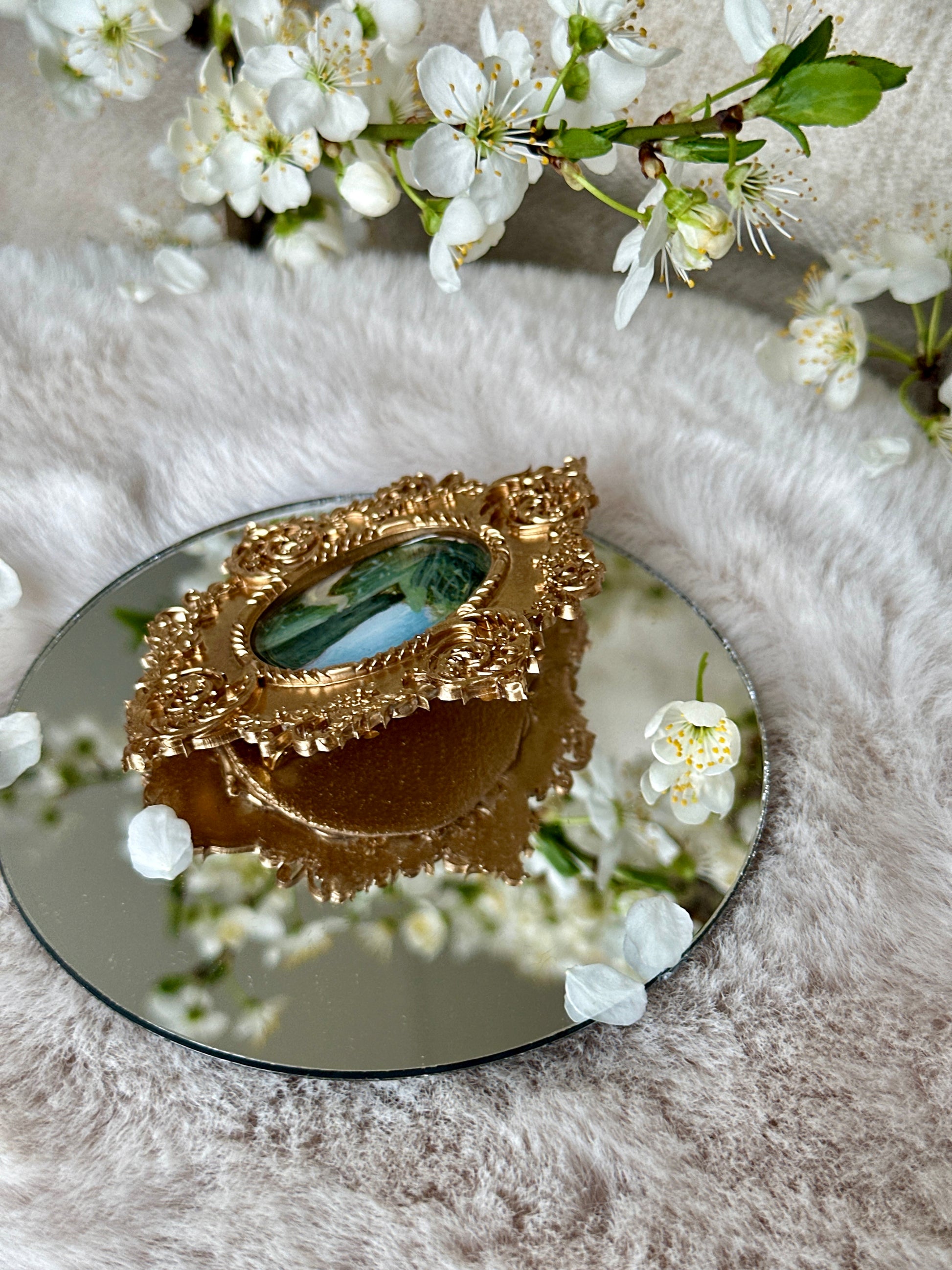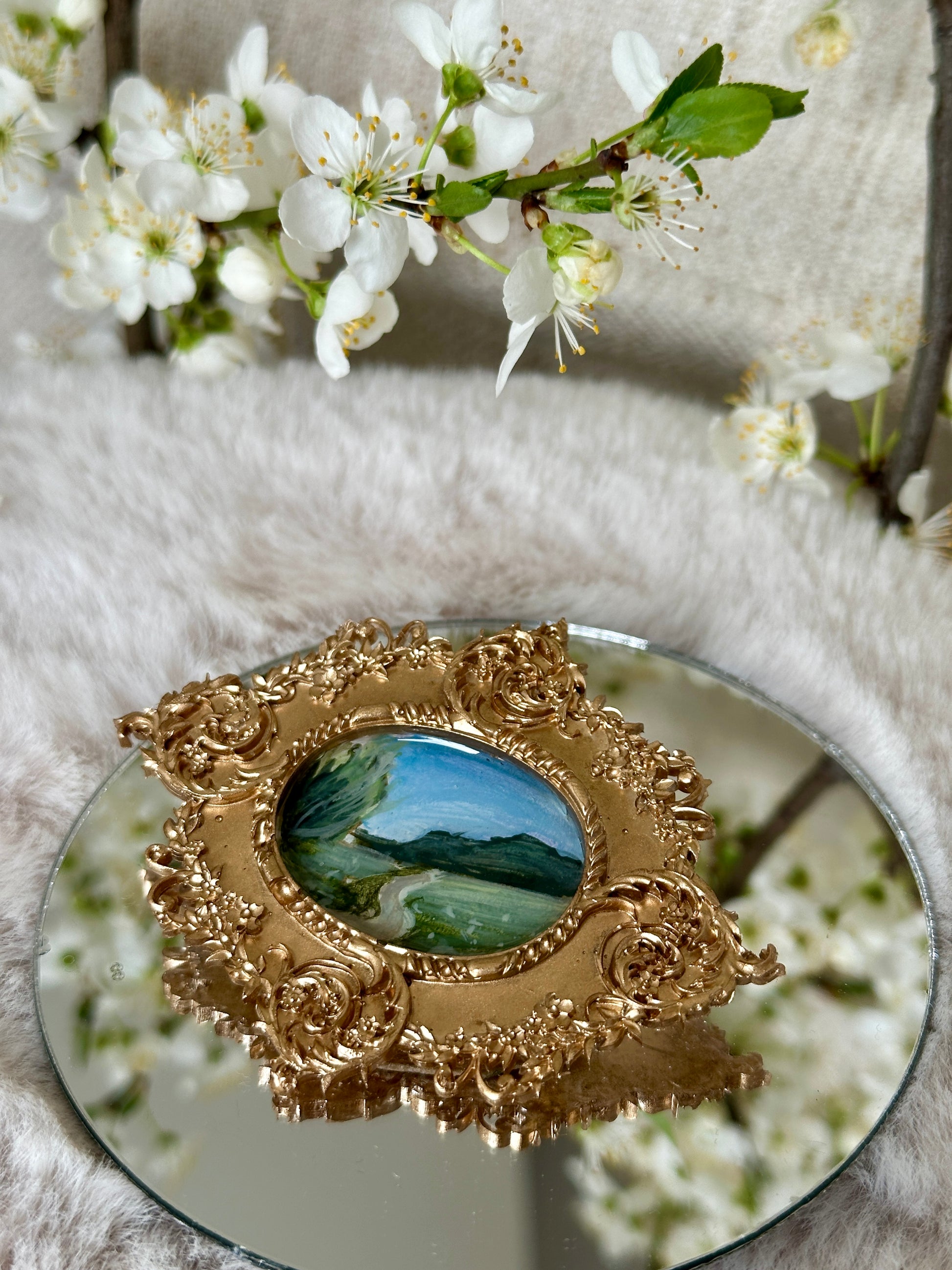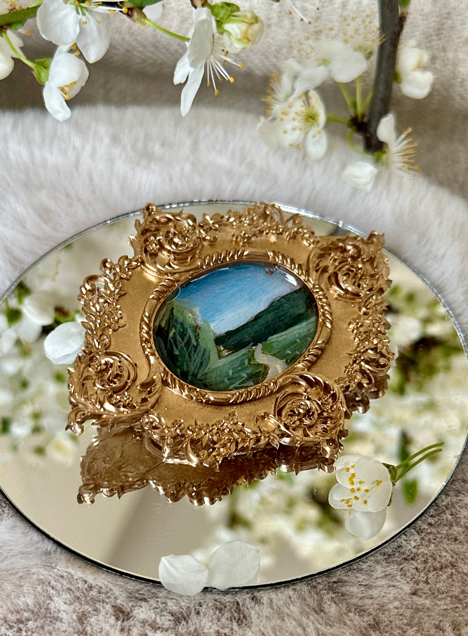Broșa „Cărarea Fermecată” este o bijuterie de poveste, îmbrăcată în strălucirea unei rame aurii baroce, ce încapsulează o pictură miniaturală inspirată de o potecă pierdută printre colinele verzi, sub cerul senin al verii. Realizată manual, această piesă este un mic tablou purtabil, protejat cu un strat fin de rășină pentru durabilitate.