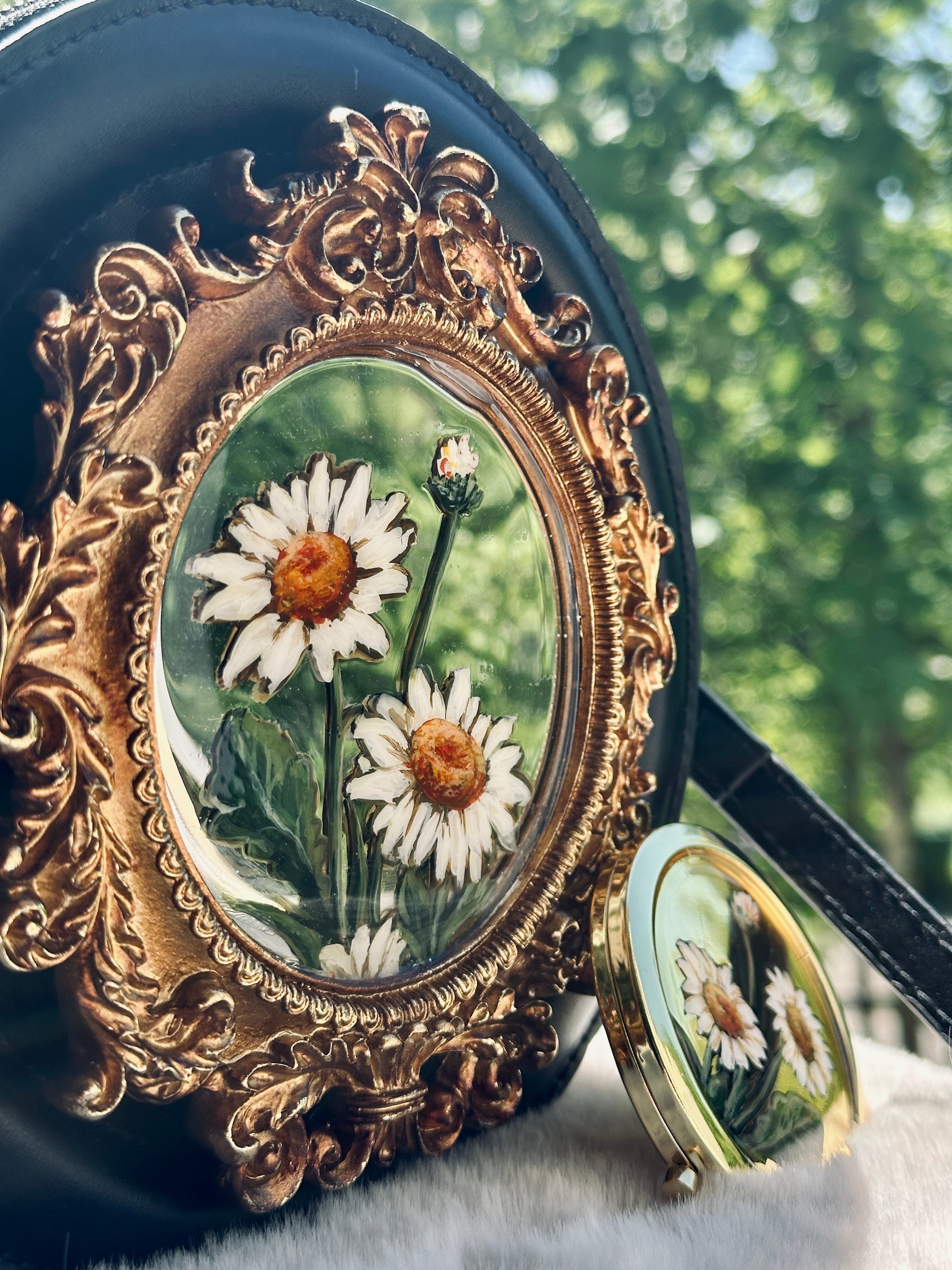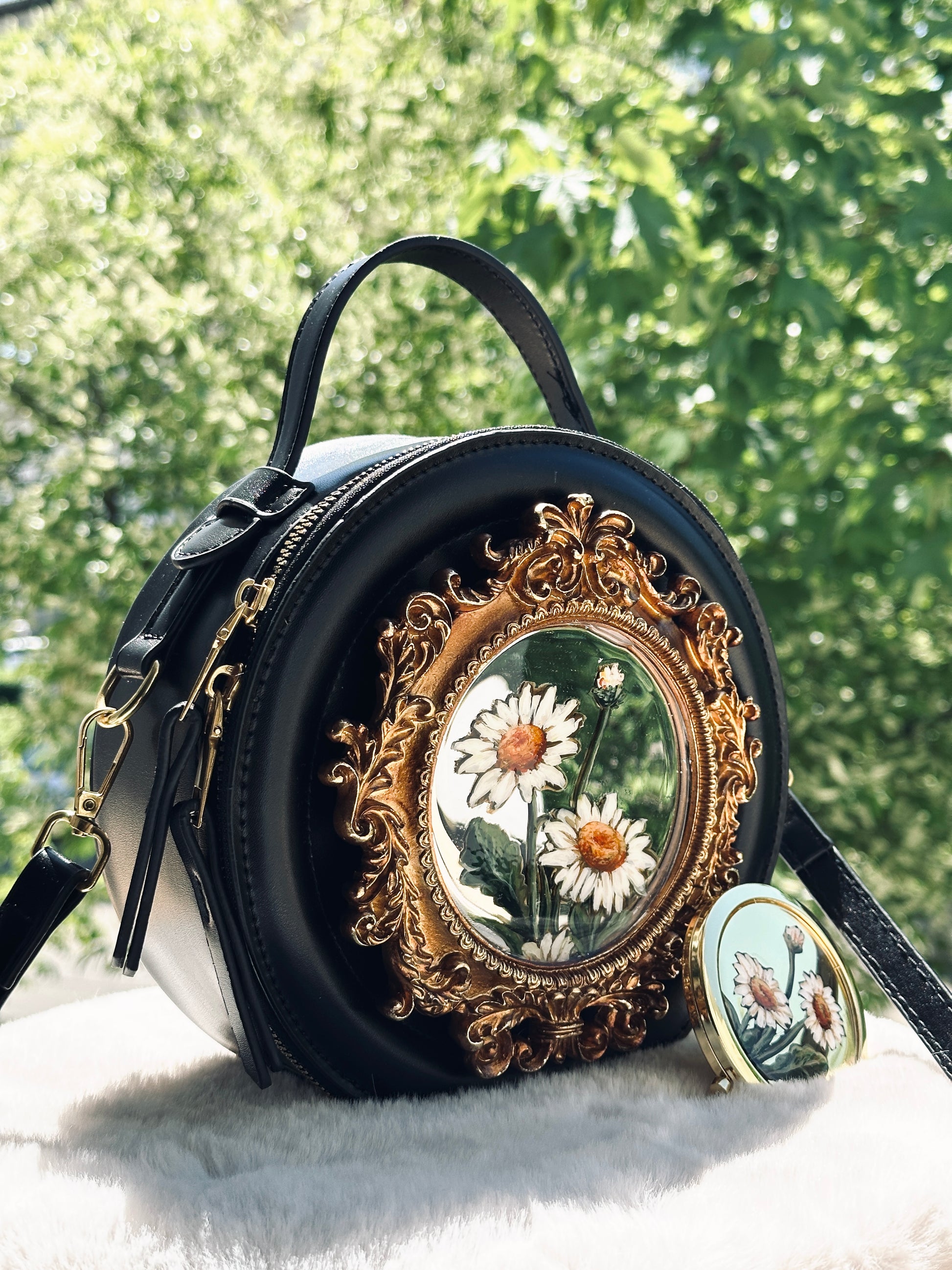 Această geantă rotundă, în ton elegant de negru, este decorată cu o pictură originală, încadrată într-o ramă barocă aurie, sigilată cu rășină UV pentru protecție și strălucire de durată.