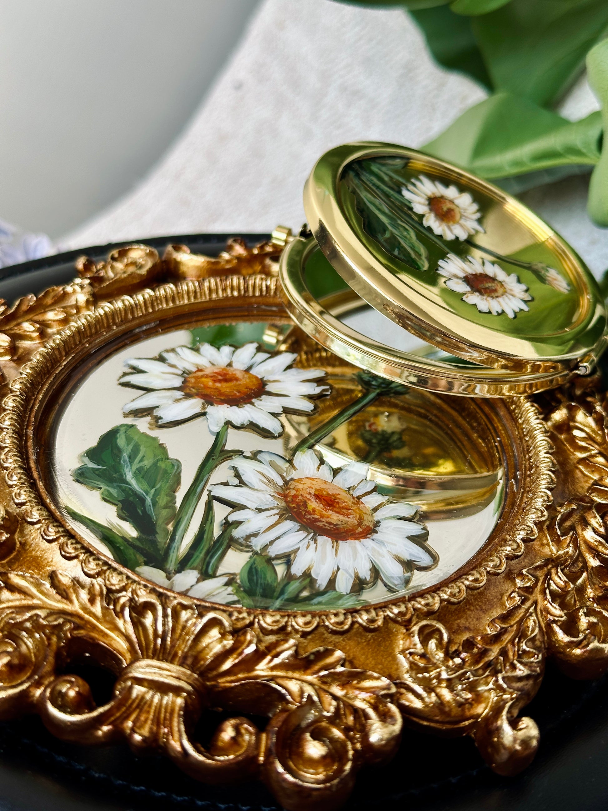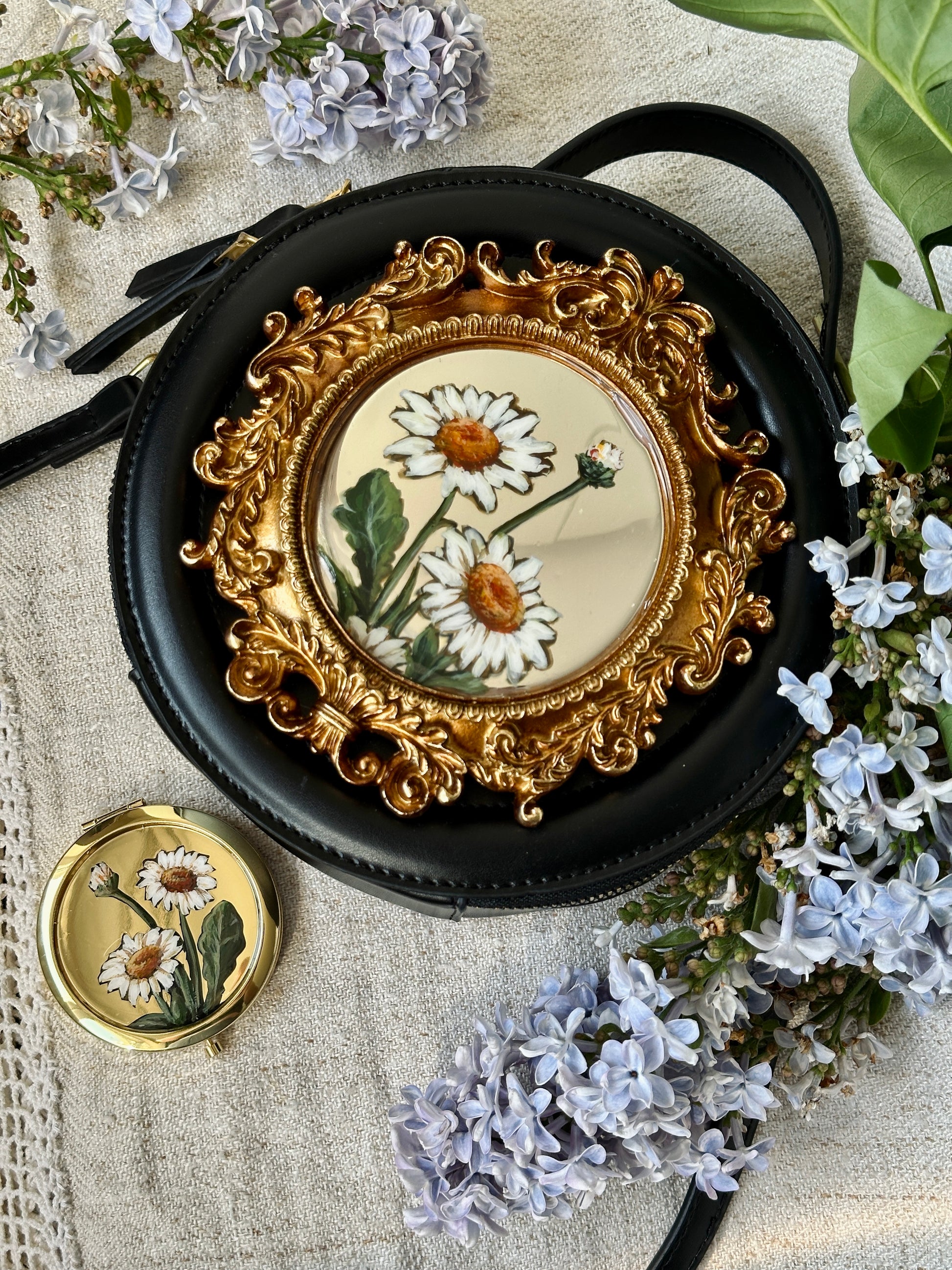 Fiecare geantă din colecție vine însoțită de o oglindă de buzunar pictată manual, ce reflectă același design, oferindu-ți o pereche de accesorii fermecate.