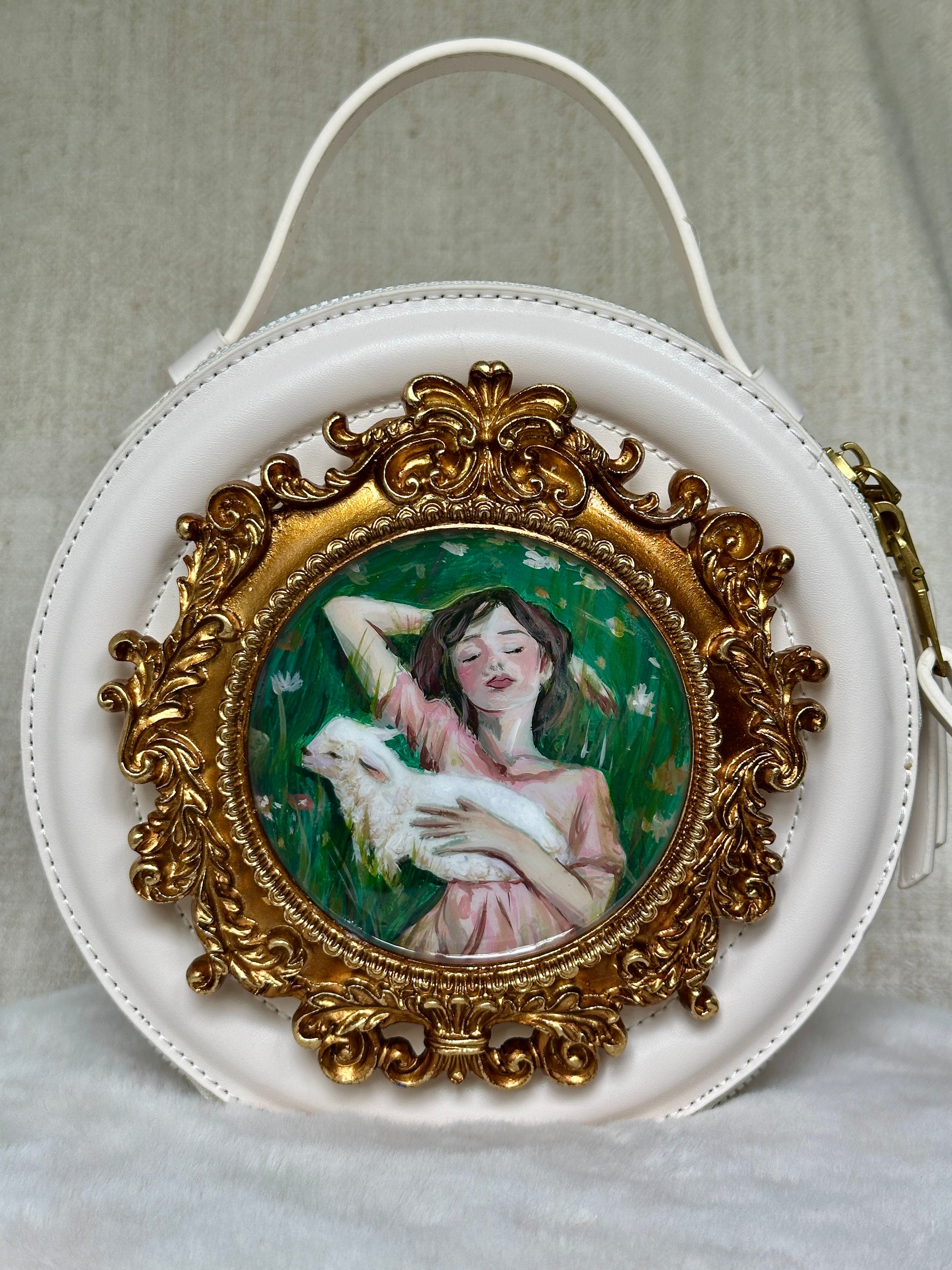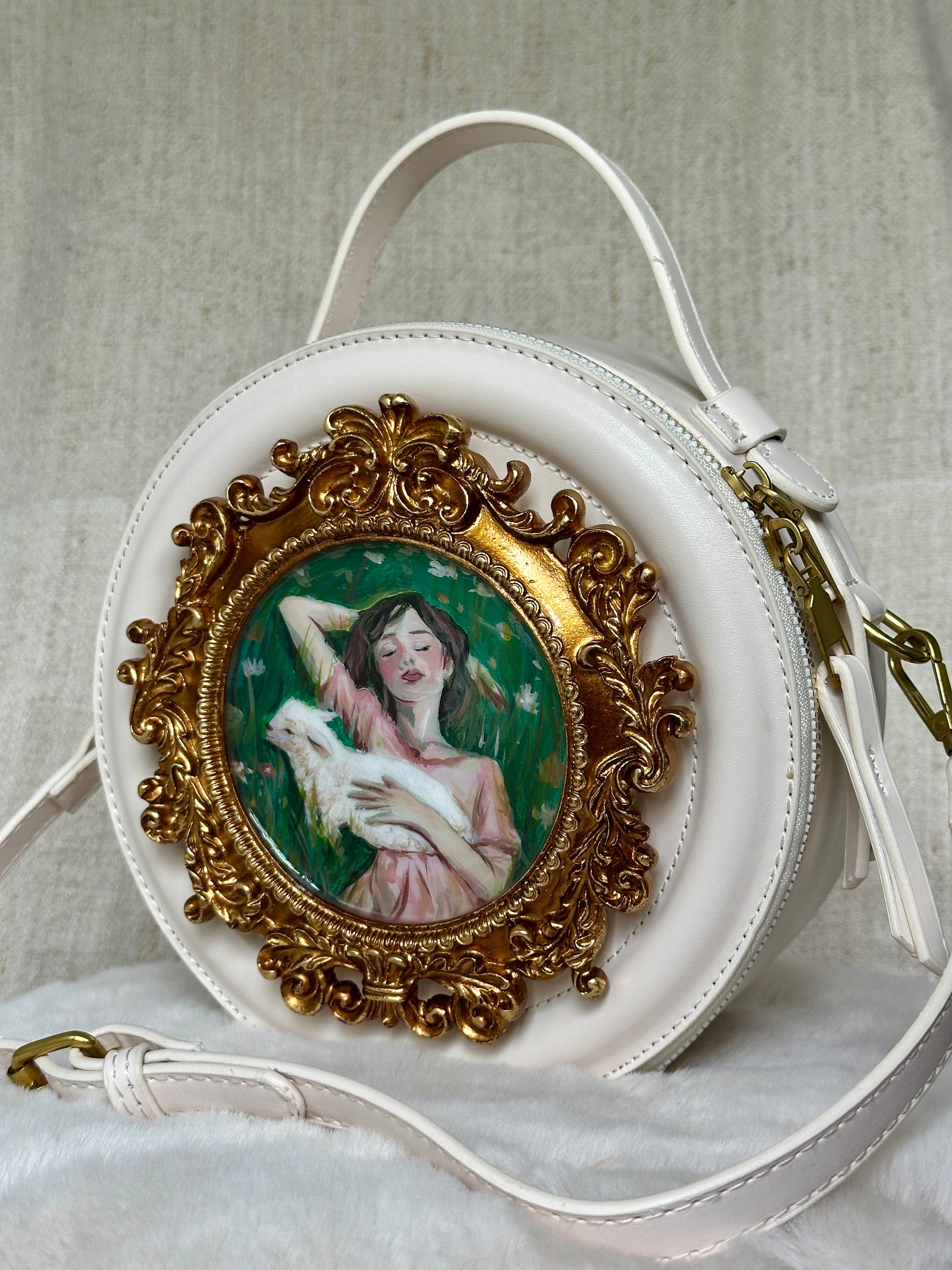Această geantă albă, delicată, surprinde legătura tainică dintre o fată senină și spiritul ei pereche – mielul. Încadrată într-o ramă barocă aurie, pictura este sigilată cu rășină UV pentru protecție și strălucire eternă.