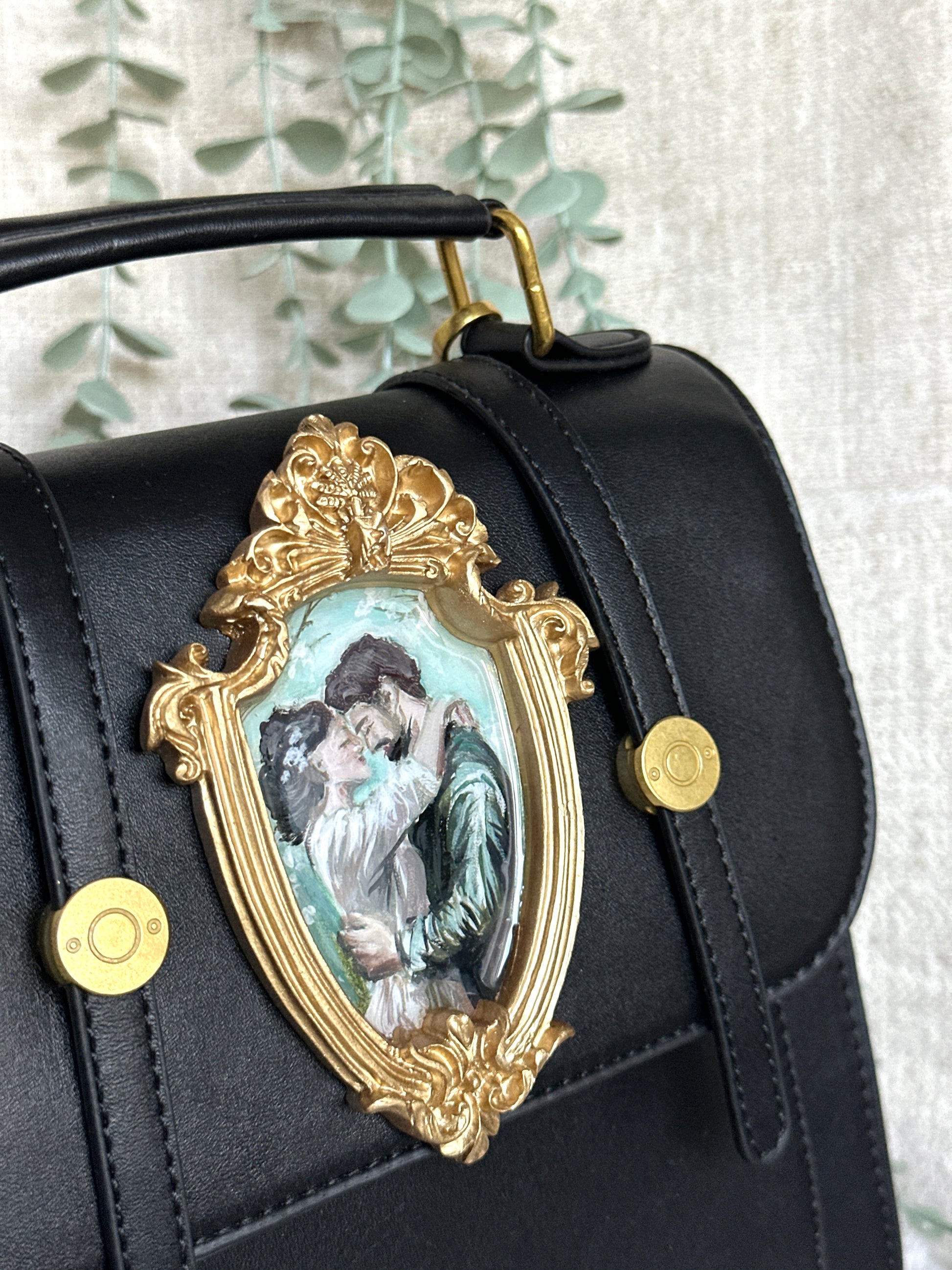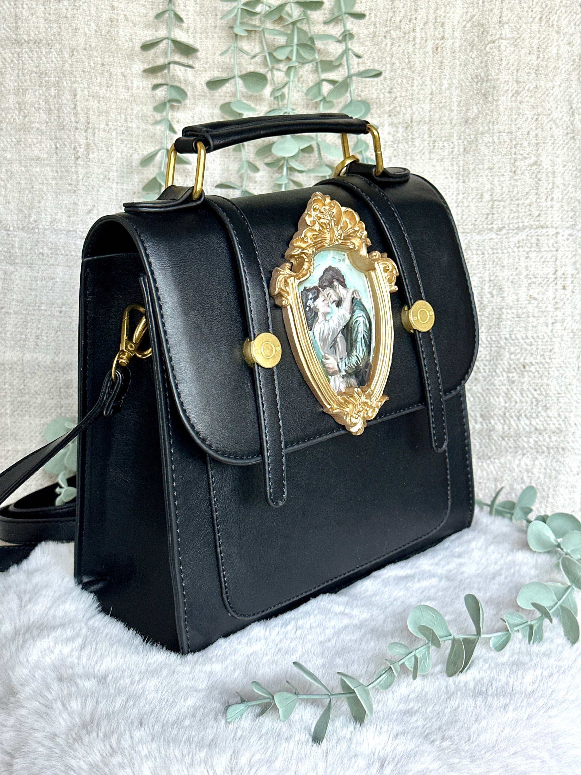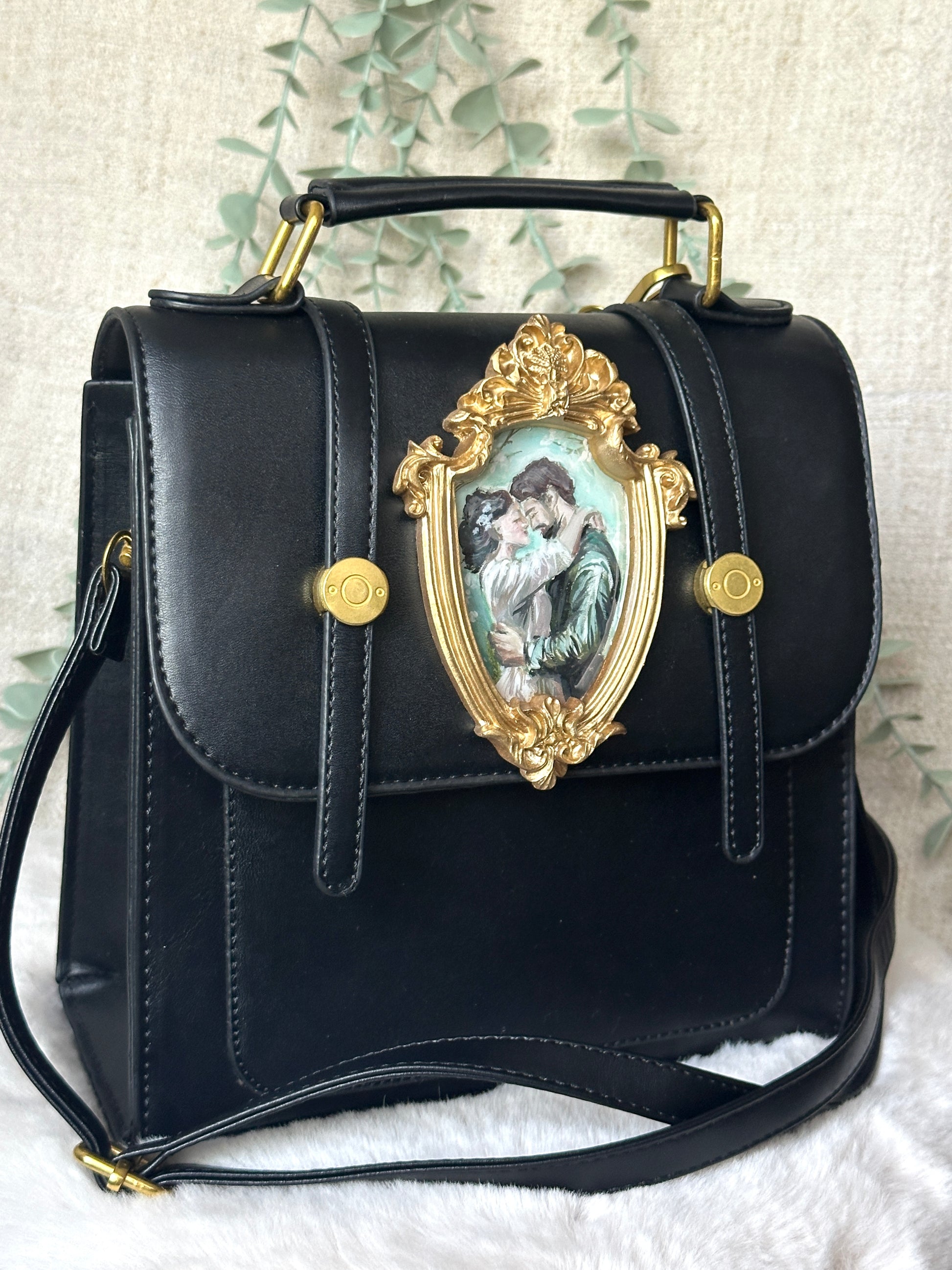,,Legământ” face parte din microcolecția „3 forme de iubire”. Acest rucsac tip „Princess” este pictat manual și transformat într-o declarație romantică purtabilă. Lucrarea, încadrată într-o ramă barocă aurie și protejată cu rășină UV, surprinde o scenă de iubire pictată cu suflet. Cu bretele reglabile și detașabile, poate fi purtat ca rucsac, geantă de umăr sau de mână.